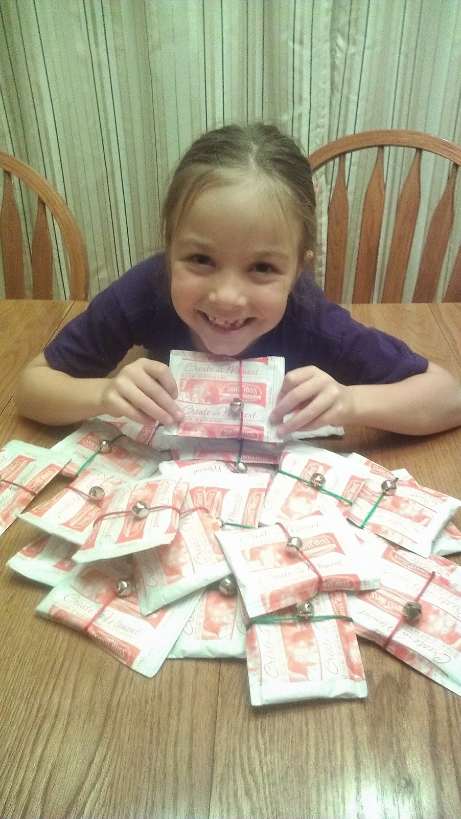 We decided to tell her class that we watch the Polar Express every year. And our favorite part is the Hot Chocolate scene, so we are handing out packets of hot chocolate to each kid in her class. Around each packet of hot chocolate is the first gift of Christmas. So Julia is going to ask what the first gift of Christmas was? And that will be wrapped around each packet of hot chocolate, which of course is a bell! Can you still hear it ringing??